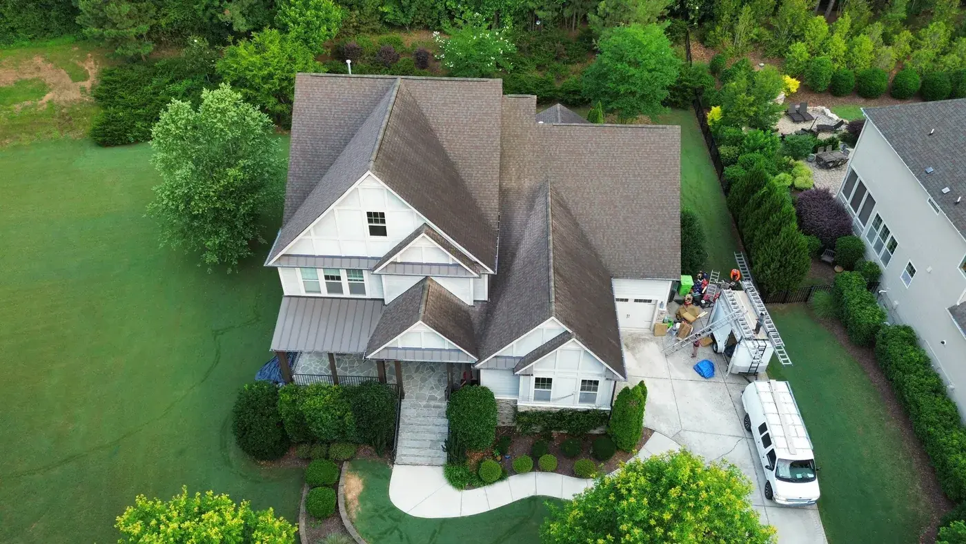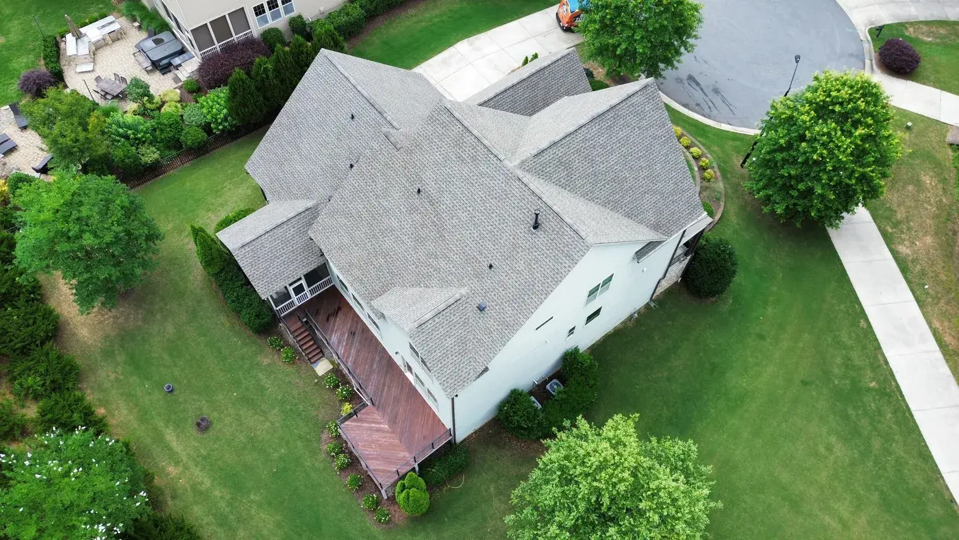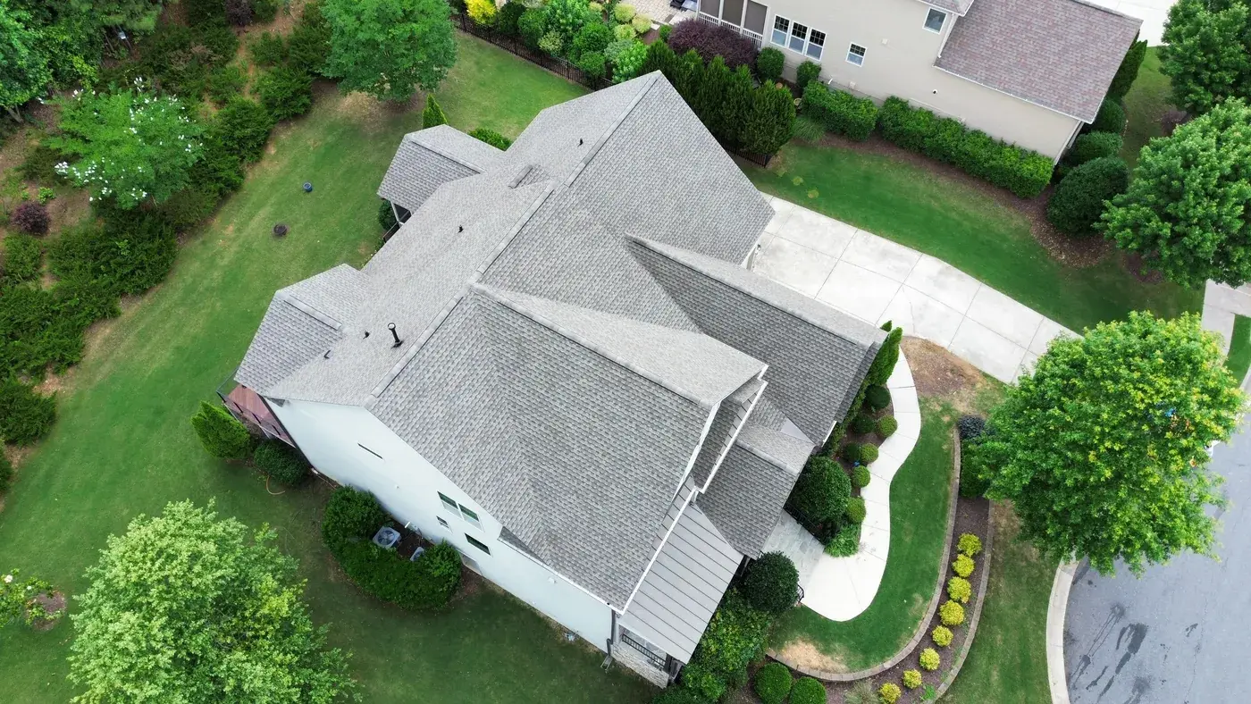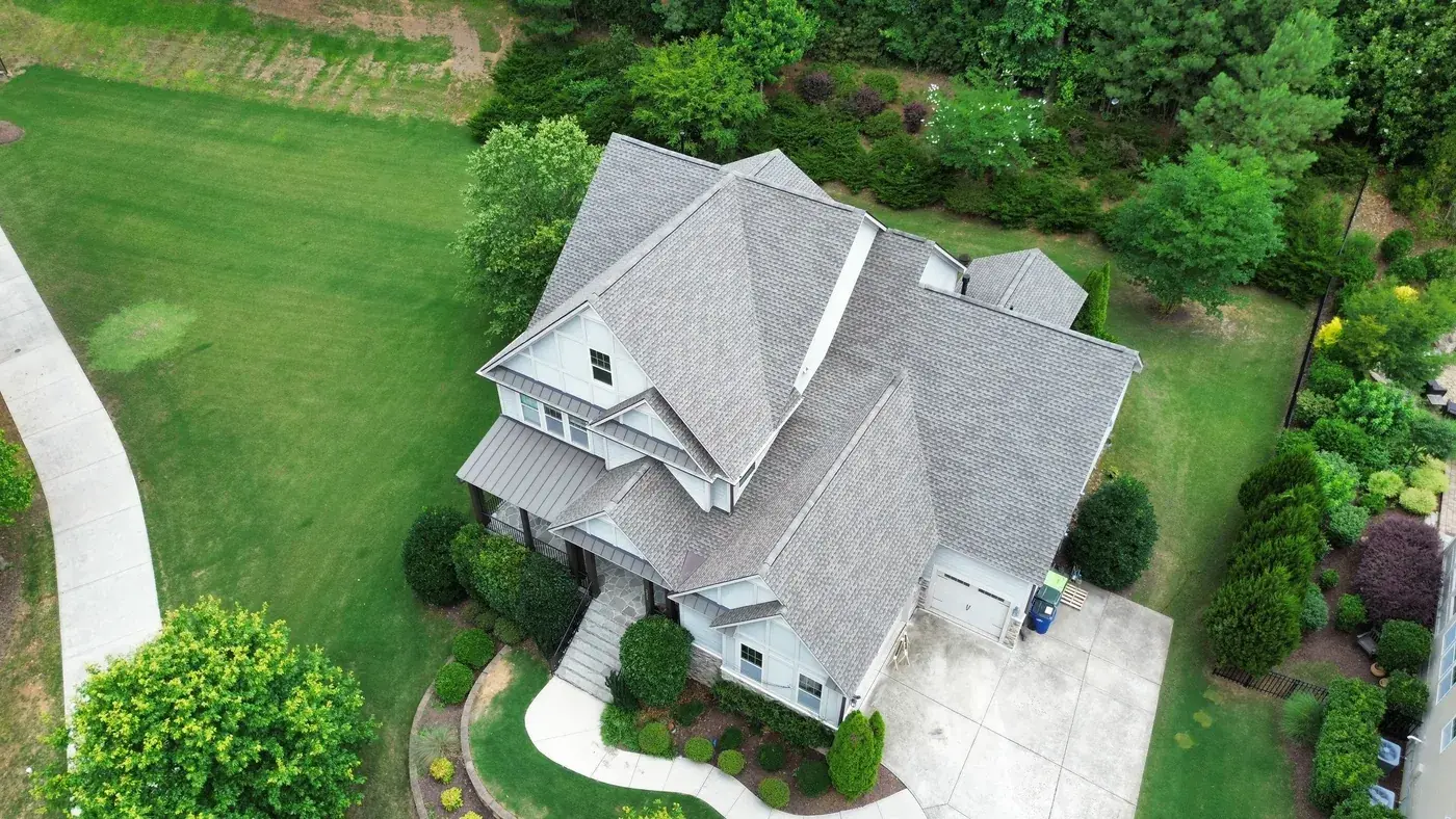 Roller Mill Ct in Raleigh, a second large home on the same street, is a substantial two-story in light gray siding with a roofline made of several intersecting gables. The 69 squares this required pushed our crew to move methodically through the valleys and around the central chimney. We installed GAF Timberline Ultra HDZ in Weathered Wood. The warm tone reads softly against the gray siding, and the layered front gables now give the home a cleaner, more deliberate top than the original. Total project: $33,500, completed June 2025.