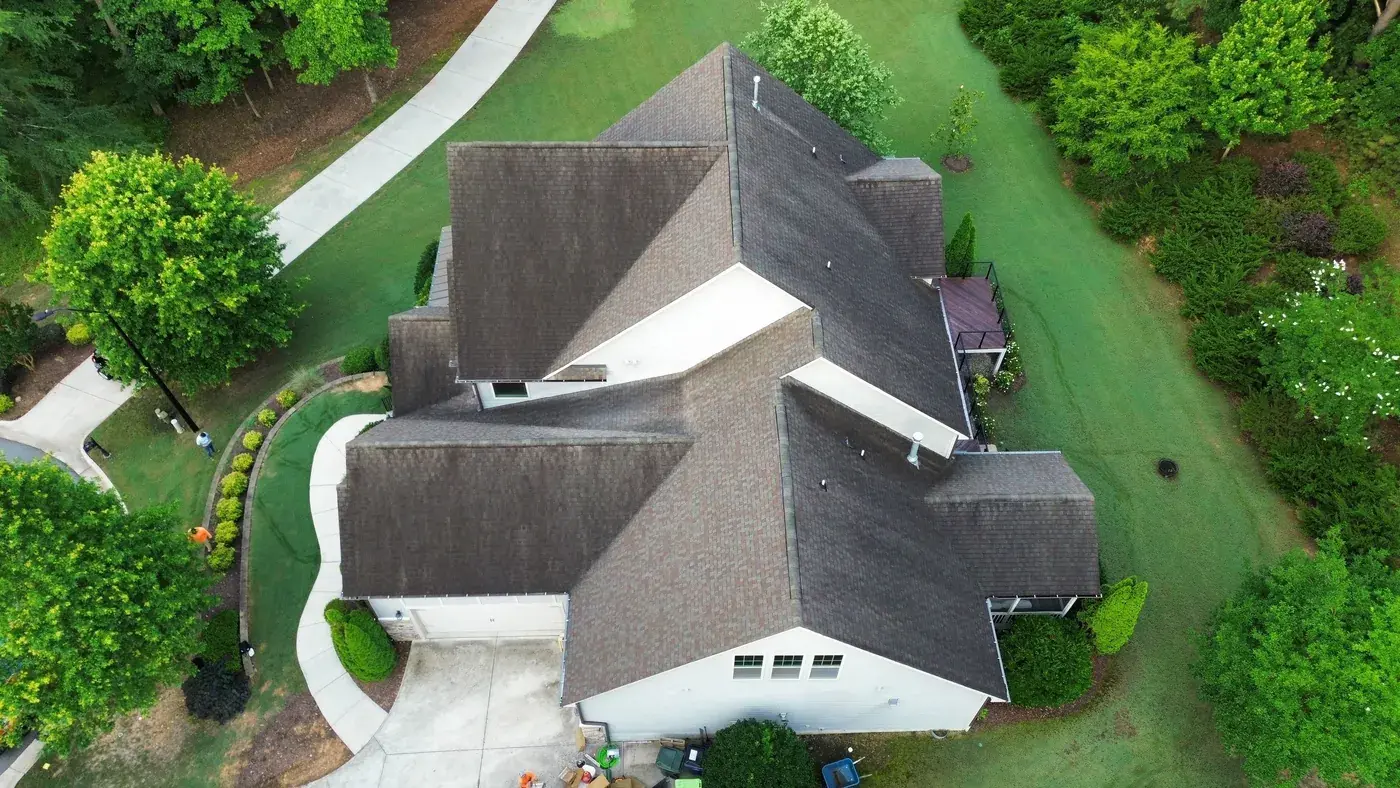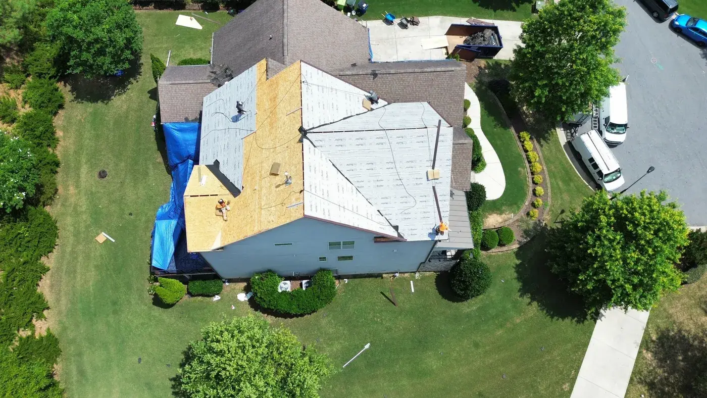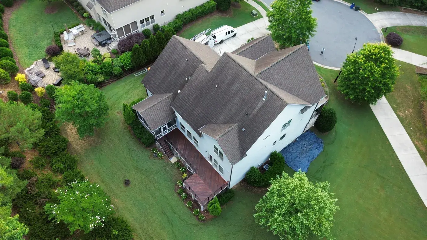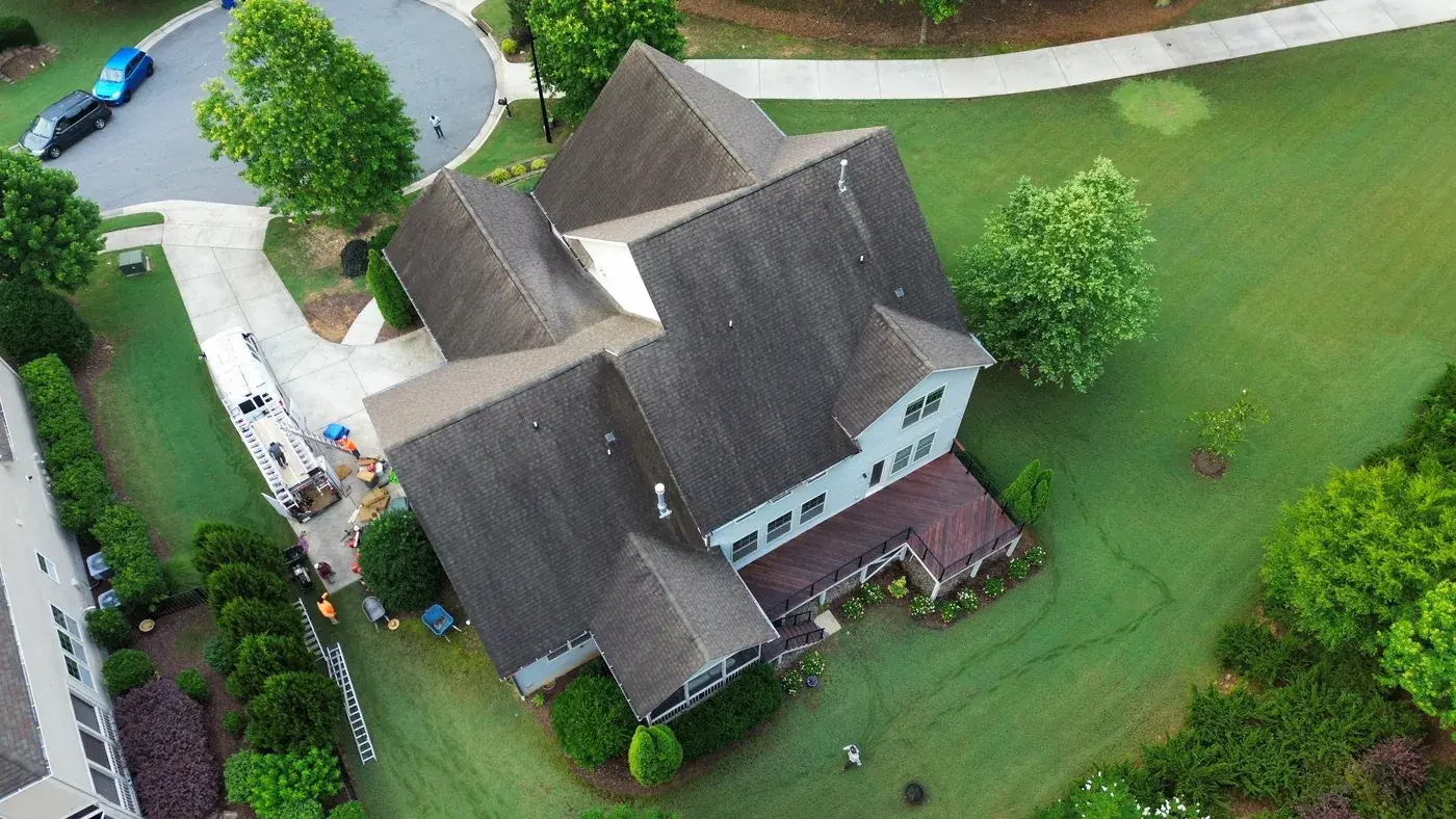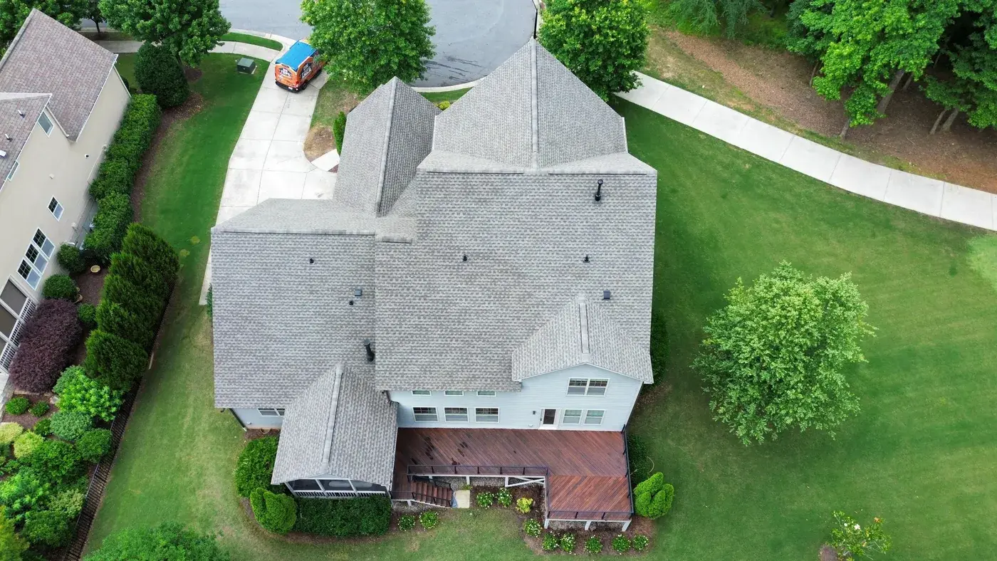 Roller Mill Ct in Raleigh, a second large home on the same street, is a substantial two-story in light gray siding with a roofline made of several intersecting gables. The 69 squares this required pushed our crew to move methodically through the valleys and around the central chimney. We installed GAF Timberline Ultra HDZ in Weathered Wood. The warm tone reads softly against the gray siding, and the layered front gables now give the home a cleaner, more deliberate top than the original. Total project: $33,500, completed June 2025.