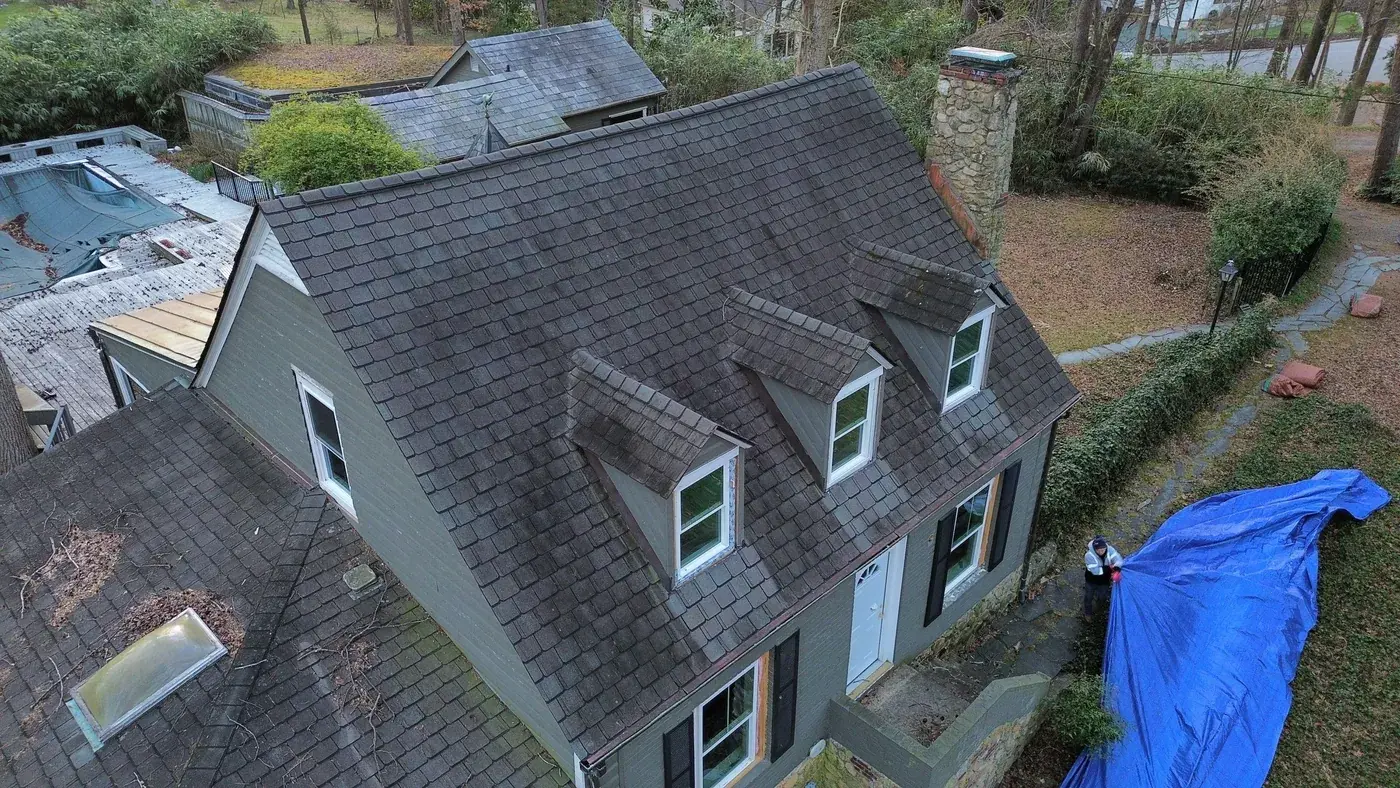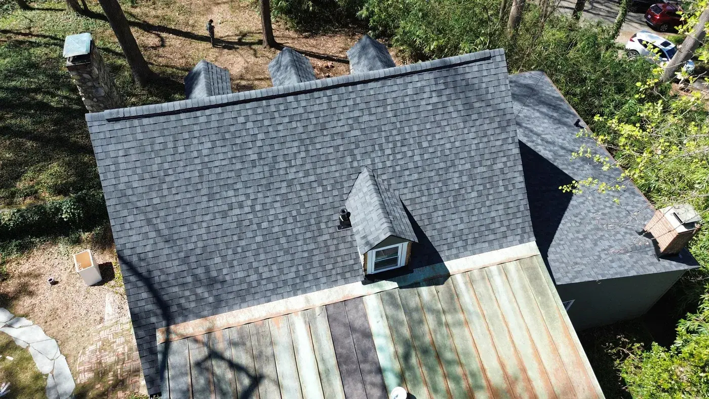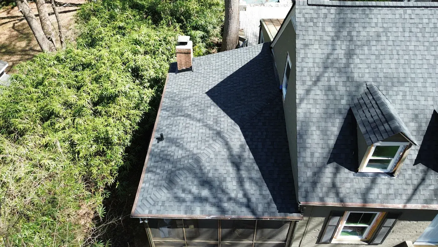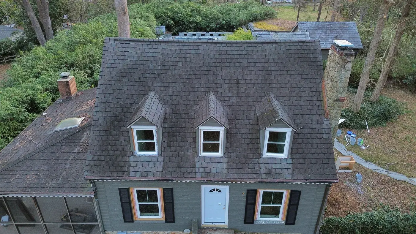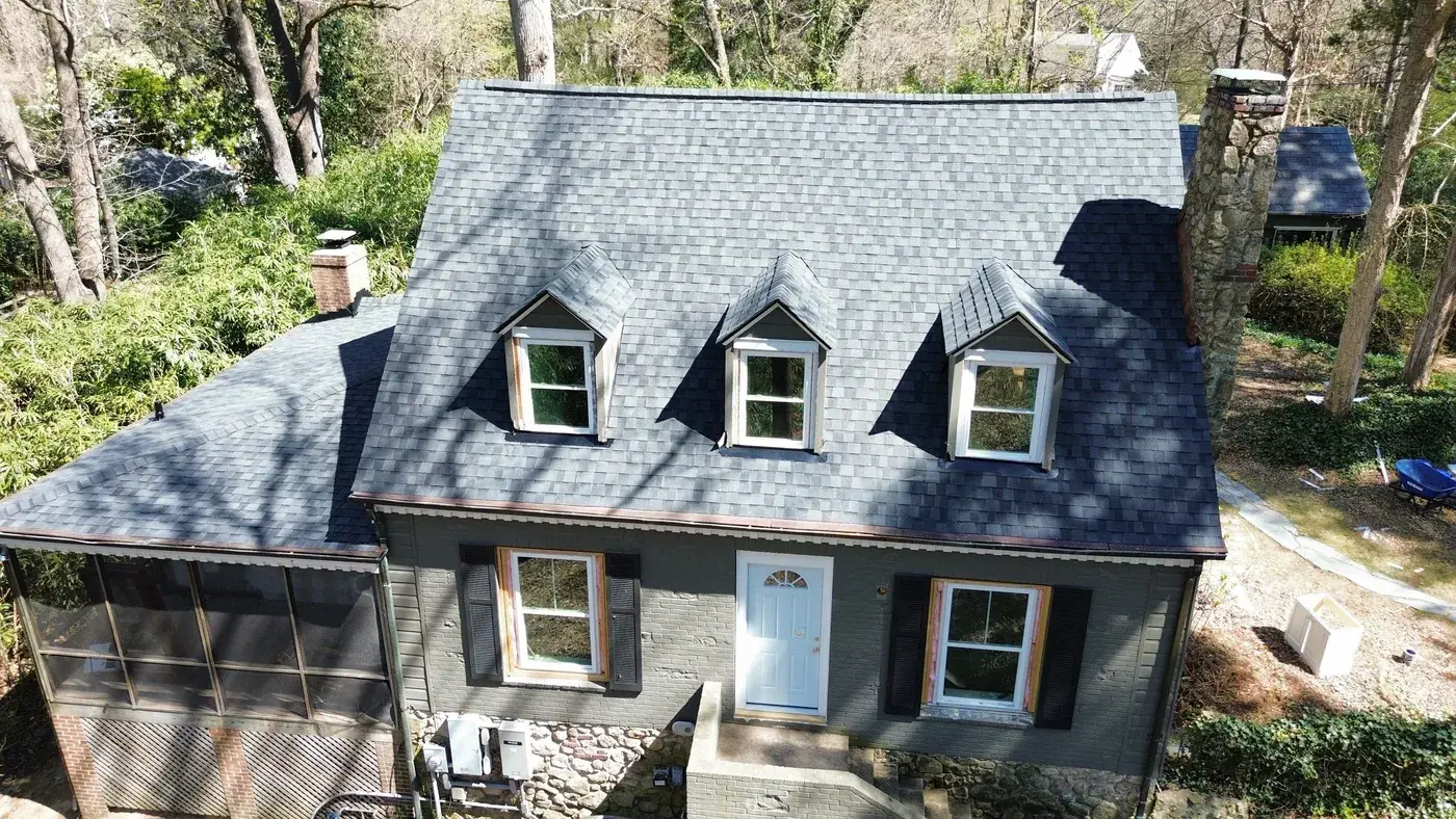 Roosevelt Dr in Chapel Hill is a charming Cape Cod home, three gabled dormers across the upper level, painted gray brick at the base, and a screened side porch tucked along the left. With three dormer faces stepping across the front, the prep had us focused on each dormer's step flashing and the valleys where they meet the main plane. We installed 23 squares of CertainTeed Landmark Premium in Moire Black. The deep black settles against the painted gray brick and gives this classic silhouette a fresh, deliberate finish. Total project: $11,330, completed March 2026.