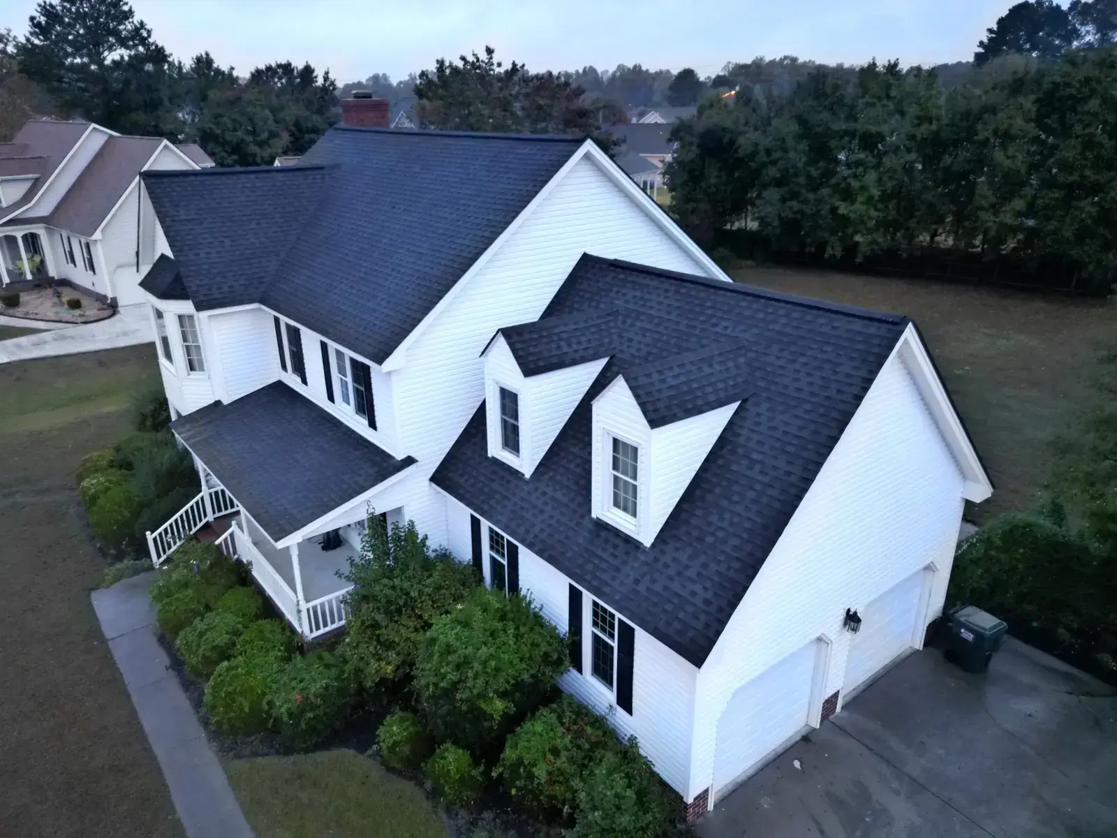 Roundtree Ln in Goldsboro is a two-story farmhouse-style home in white siding with three front-facing dormers stepping across the upper level, a covered side porch on the left, and a long wing extending to the right. With three dormer faces and a side porch tie-in, the 39 squares this took meant patient step flashing throughout. We installed GAF Timberline HDZ in Pewter Gray. The cool gray reads beautifully against the white siding and gives this carefully detailed farmhouse a top that honors its considered architecture. Total project: $18,000, completed October 2025.