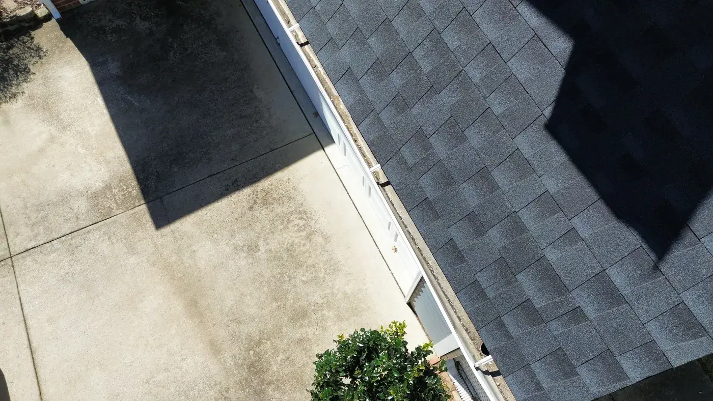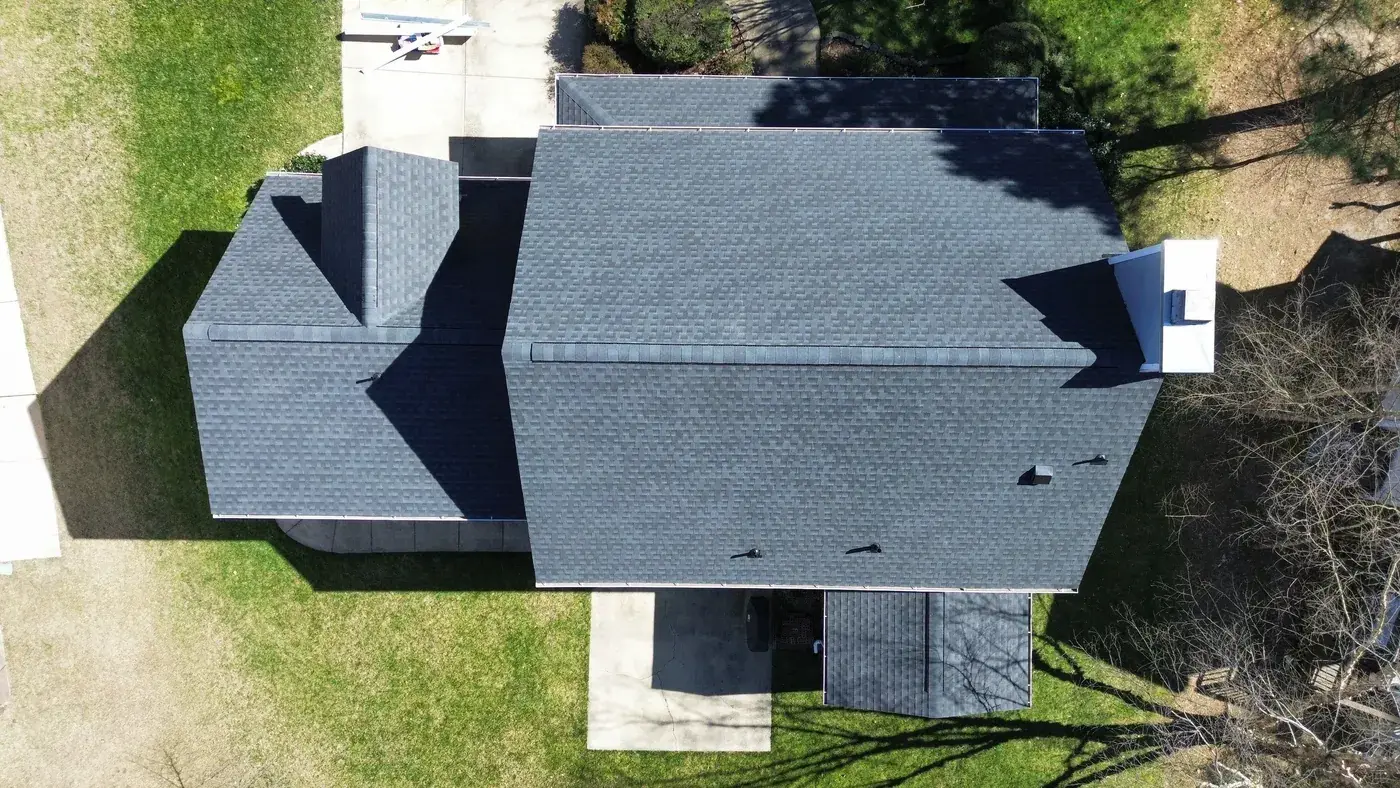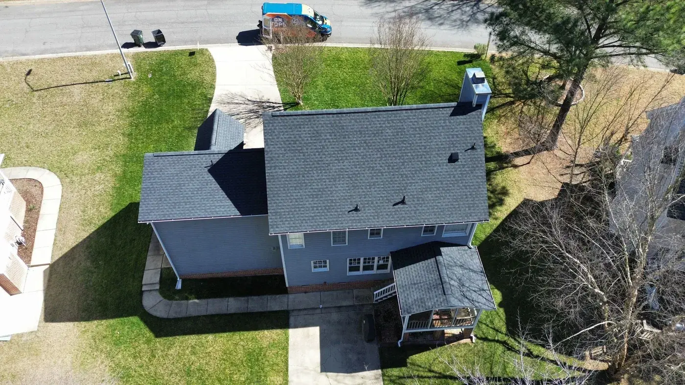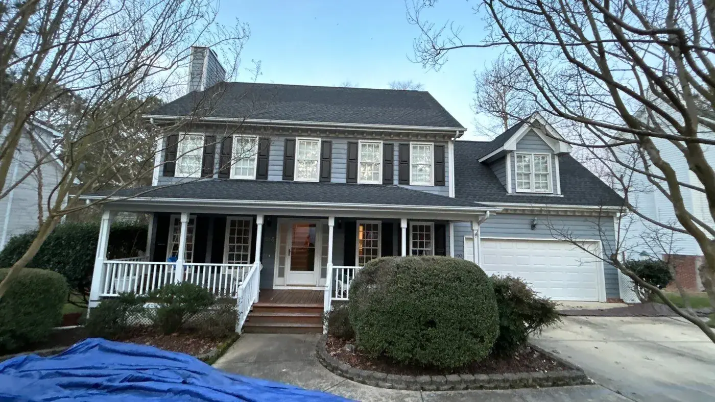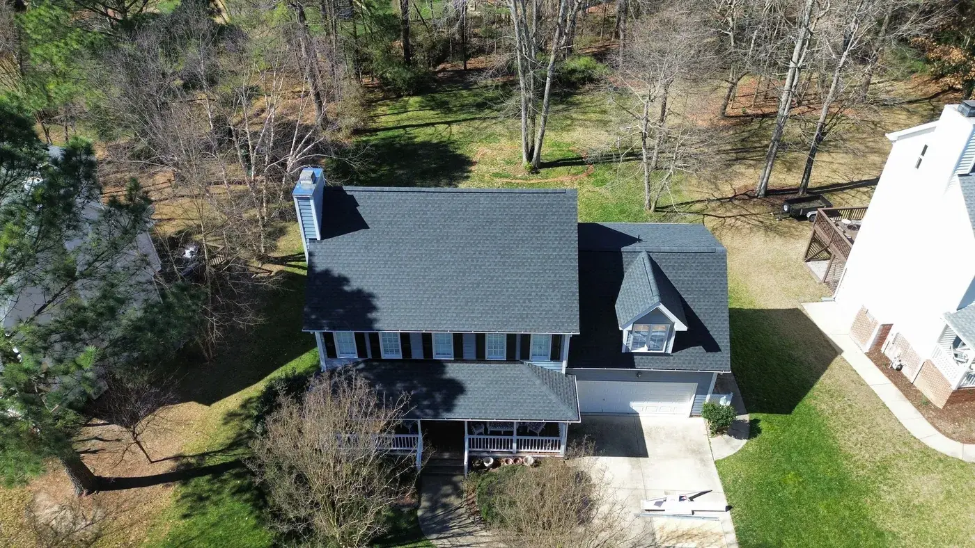 Sandy Point Way in Holly Springs is a two-story home in white siding over partial brick, with a small center gable rising above the entry and a side wing extending off to the right. The 30 squares this took ran across two distinct gable heights meeting at a key valley. We installed GAF Timberline HDZ in Charcoal. The dark color anchors the white-and-brick palette and gives this established home a freshly finished top suited to its tidy wooded setting. Total project: $12,615, completed March 2024.