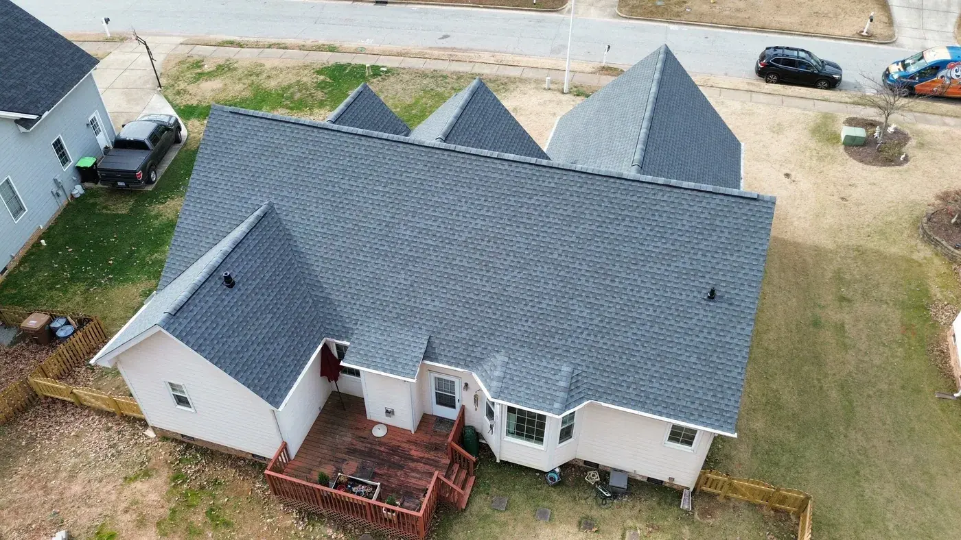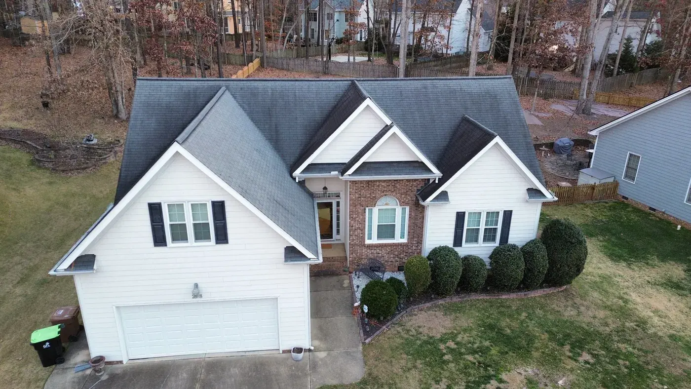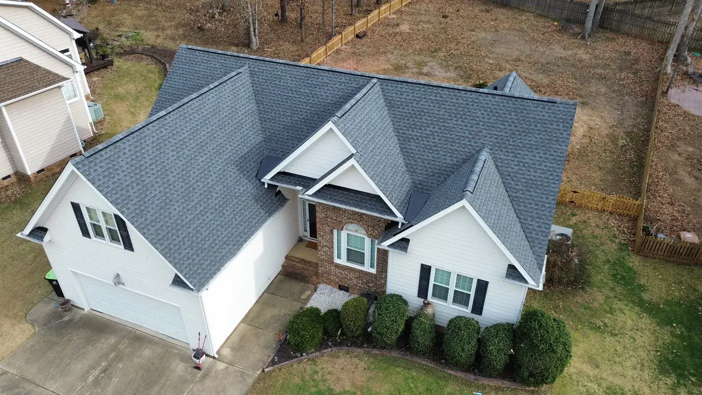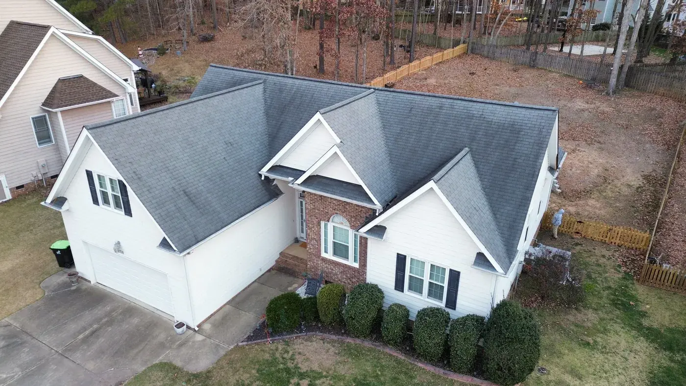 Saranac Ridge Dr in Holly Springs is a single-story home in cream siding over red brick, with an attached single-bay garage anchoring the left and a small porch gable rising over the entry. The 42 squares this took ran across two distinct gable heights meeting at a key valley. We installed GAF Timberline HDZ in Pewter Gray. The cool tone reads beautifully against the warm brick and cream siding, and the home now wears a roof that pulls every element of the front elevation together. Total project: $18,880, completed December 2025.