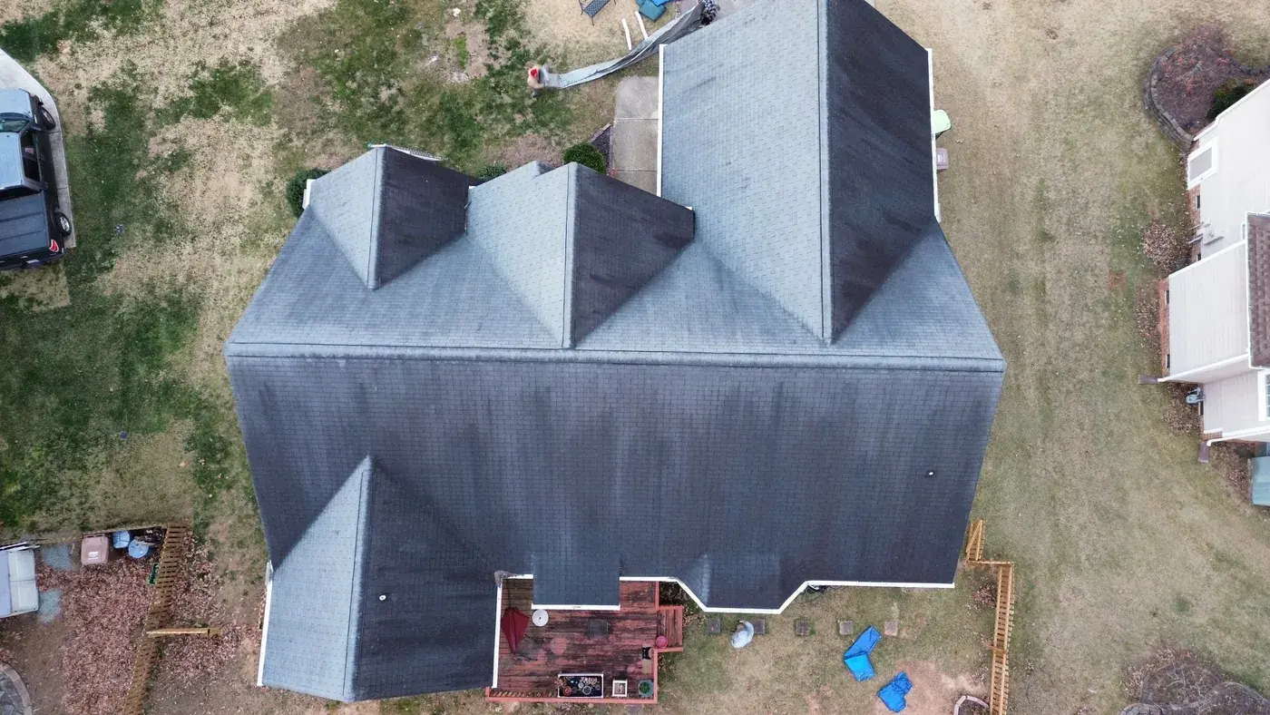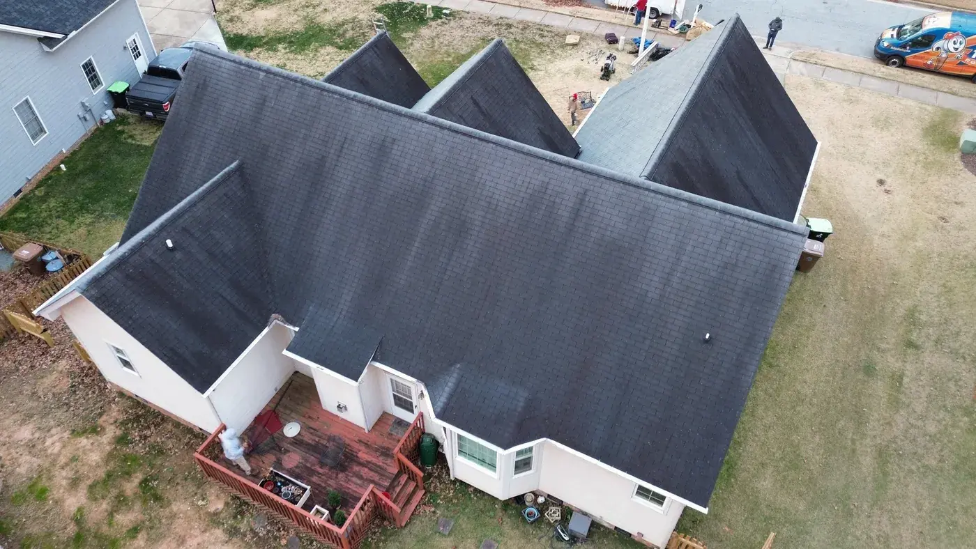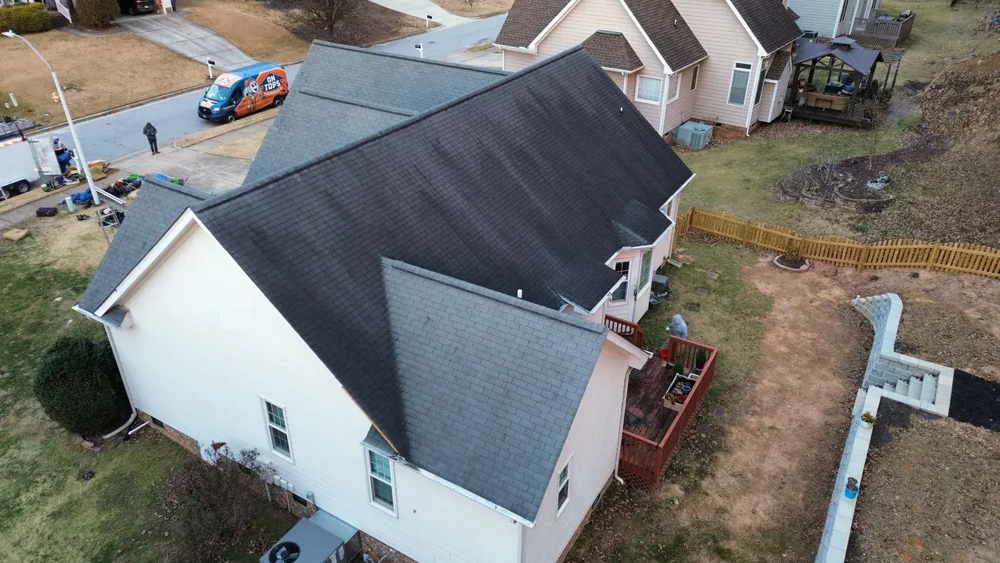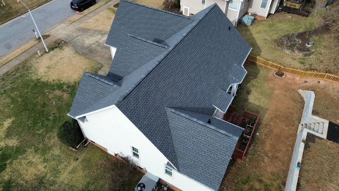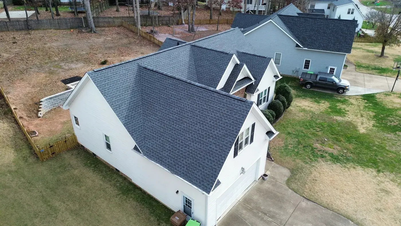 Saranac Ridge Dr in Holly Springs is a single-story home in cream siding over red brick, with an attached single-bay garage anchoring the left and a small porch gable rising over the entry. The 42 squares this took ran across two distinct gable heights meeting at a key valley. We installed GAF Timberline HDZ in Pewter Gray. The cool tone reads beautifully against the warm brick and cream siding, and the home now wears a roof that pulls every element of the front elevation together. Total project: $18,880, completed December 2025.