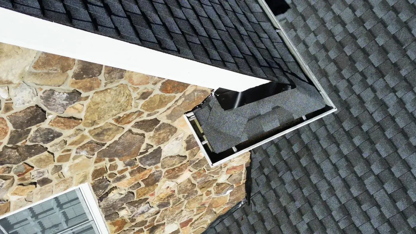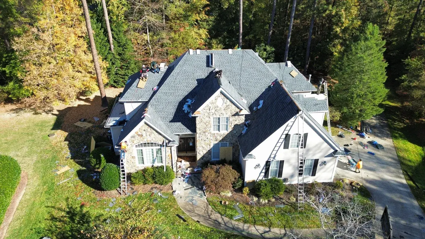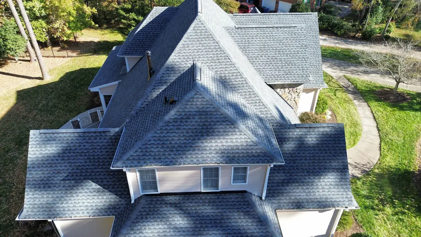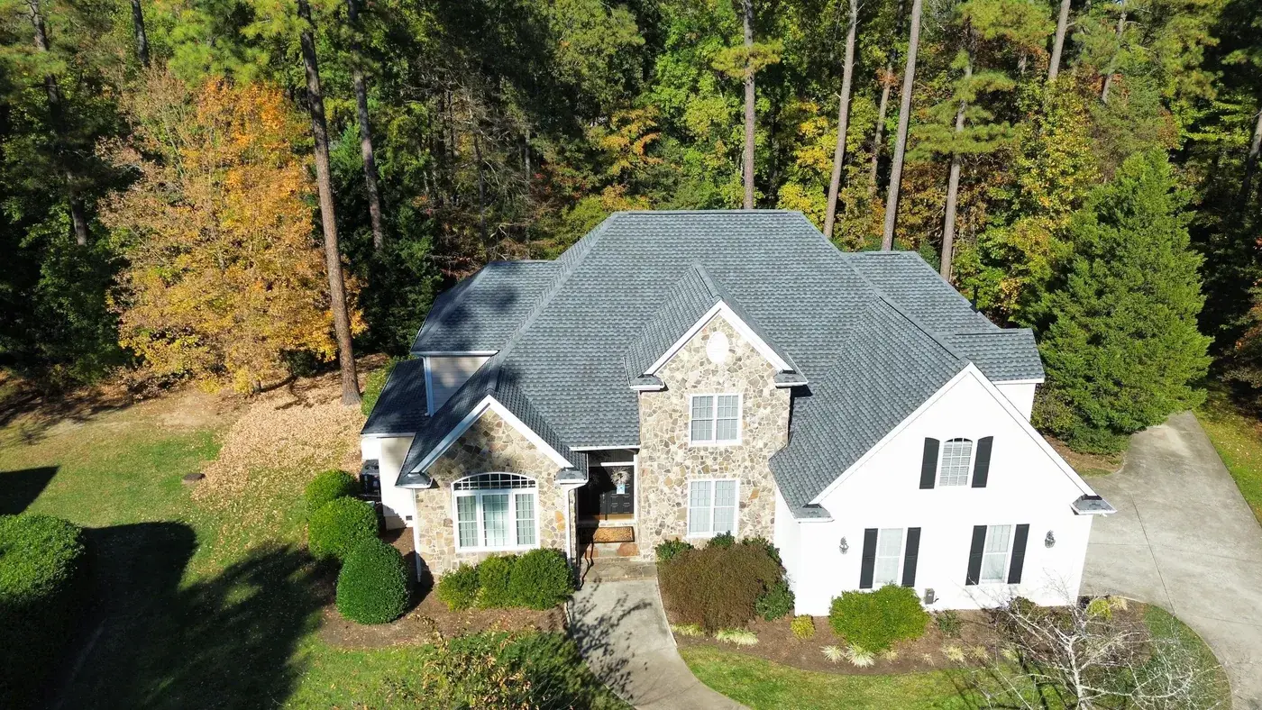 Shadow Moss Pl in Durham brought us a beautiful two-story home in white siding wrapped with a substantial stone facade across the entry, a bay window projecting beside it, and several front-facing gables stepping across the elevation. The 60 squares this took meant patient prep across multiple gable faces, plus careful flashing where the new shingle meets the stonework. We installed GAF Timberline Ultra HDZ in Pewter Gray. The cool gray reads softly against the warm stone and white siding, giving the home a calm, finished crown. Total project: $25,940, completed November 2023.