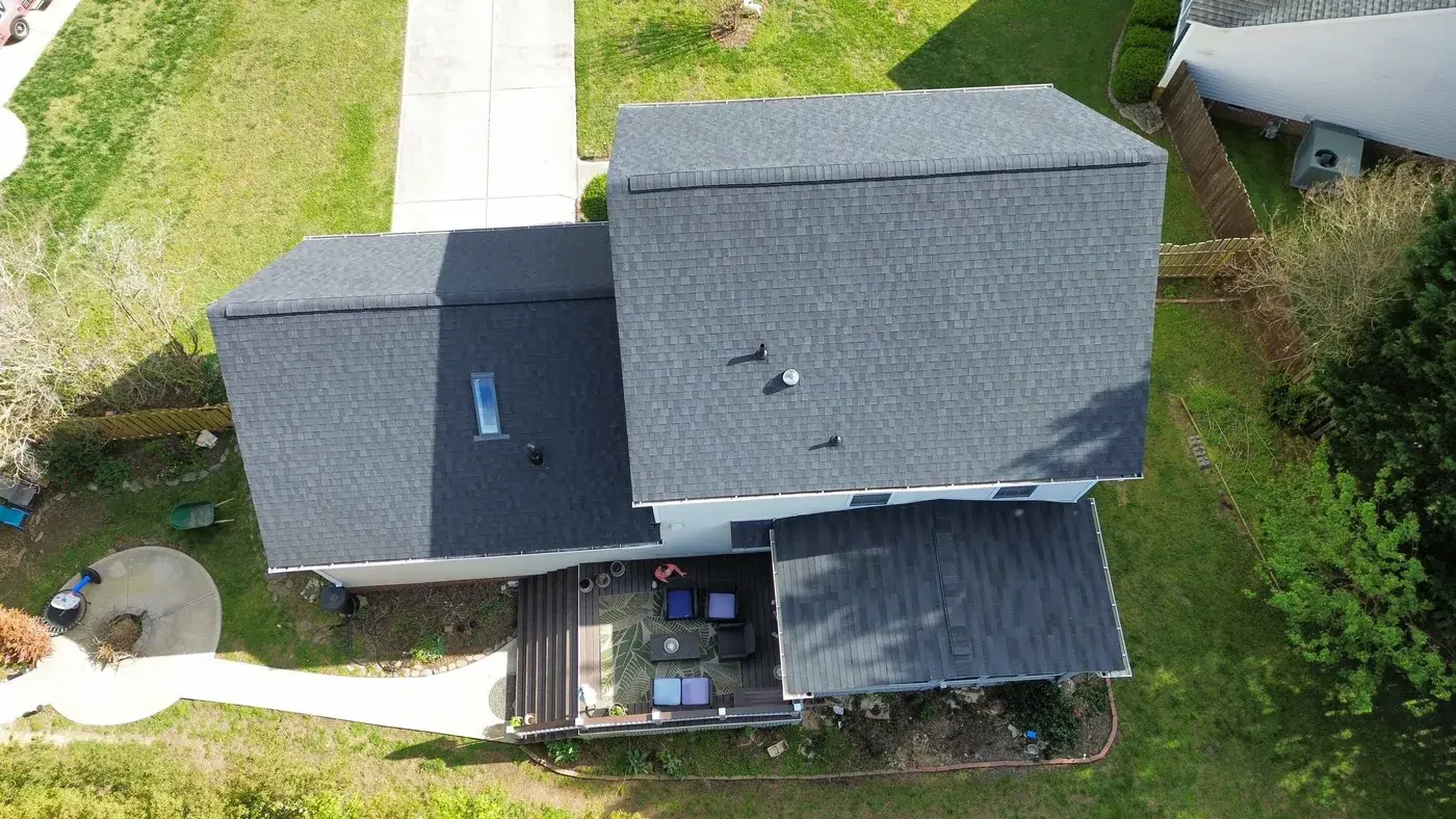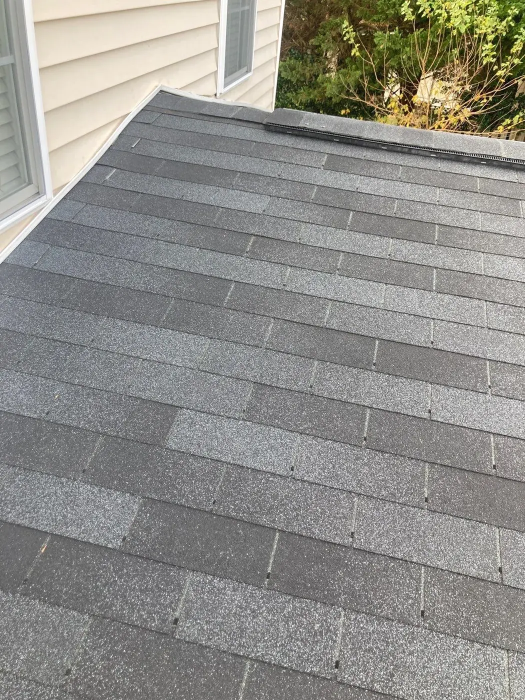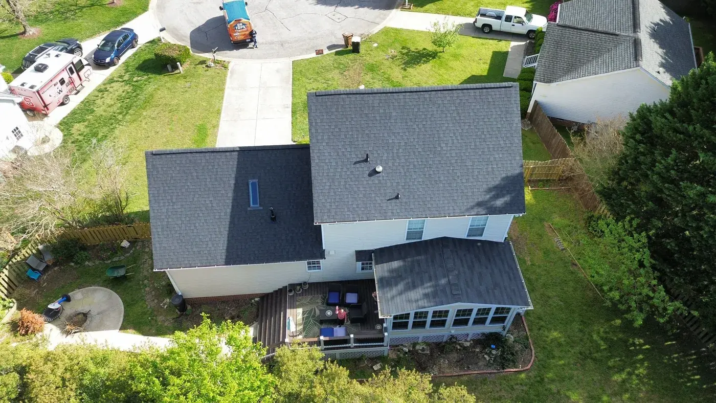 Springside Dr in Holly Springs is a clean two-story home in white siding with black shutters and a center brick chimney rising at the front face. The 25 squares this took ran across a simple gable design with the front chimney as the key flashing detail. We installed CertainTeed Landmark in Charcoal. The dark color reads sharp against the white siding and gives this trim, symmetrical home a deliberate top that lets the chimney stand out as it should. Total project: $10,375, completed April 2024.