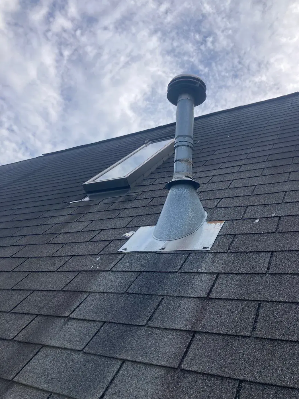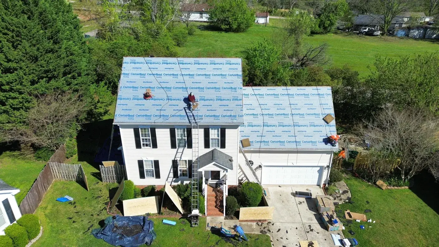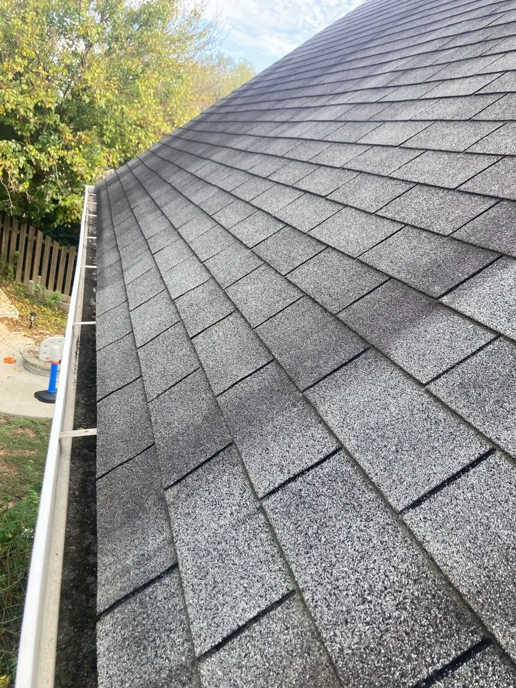 Springside Dr in Holly Springs is a clean two-story home in white siding with black shutters and a center brick chimney rising at the front face. The 25 squares this took ran across a simple gable design with the front chimney as the key flashing detail. We installed CertainTeed Landmark in Charcoal. The dark color reads sharp against the white siding and gives this trim, symmetrical home a deliberate top that lets the chimney stand out as it should. Total project: $10,375, completed April 2024.