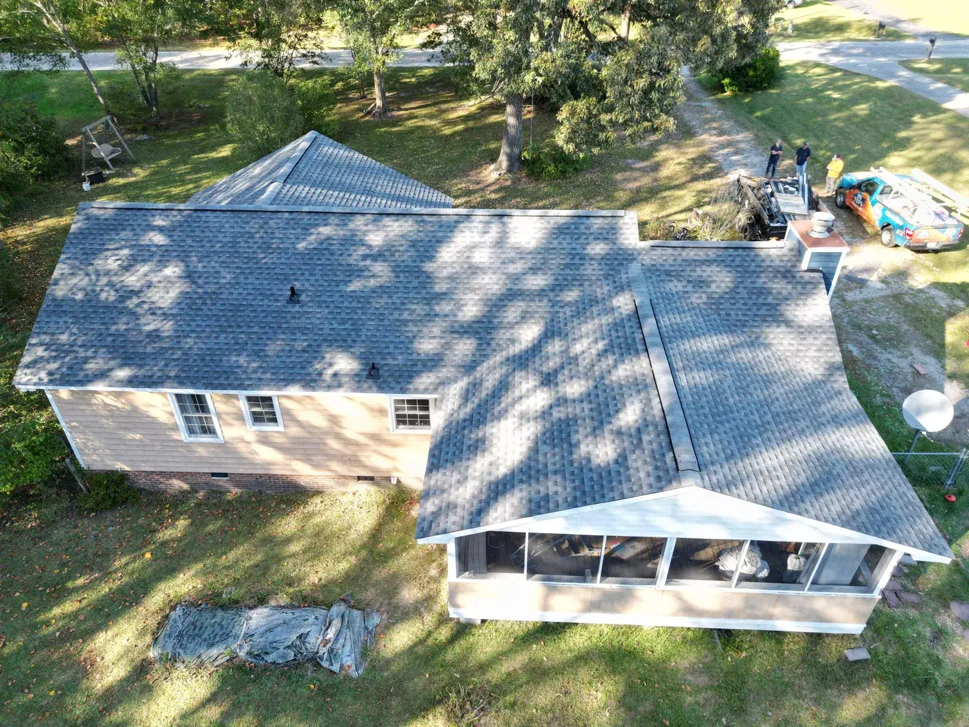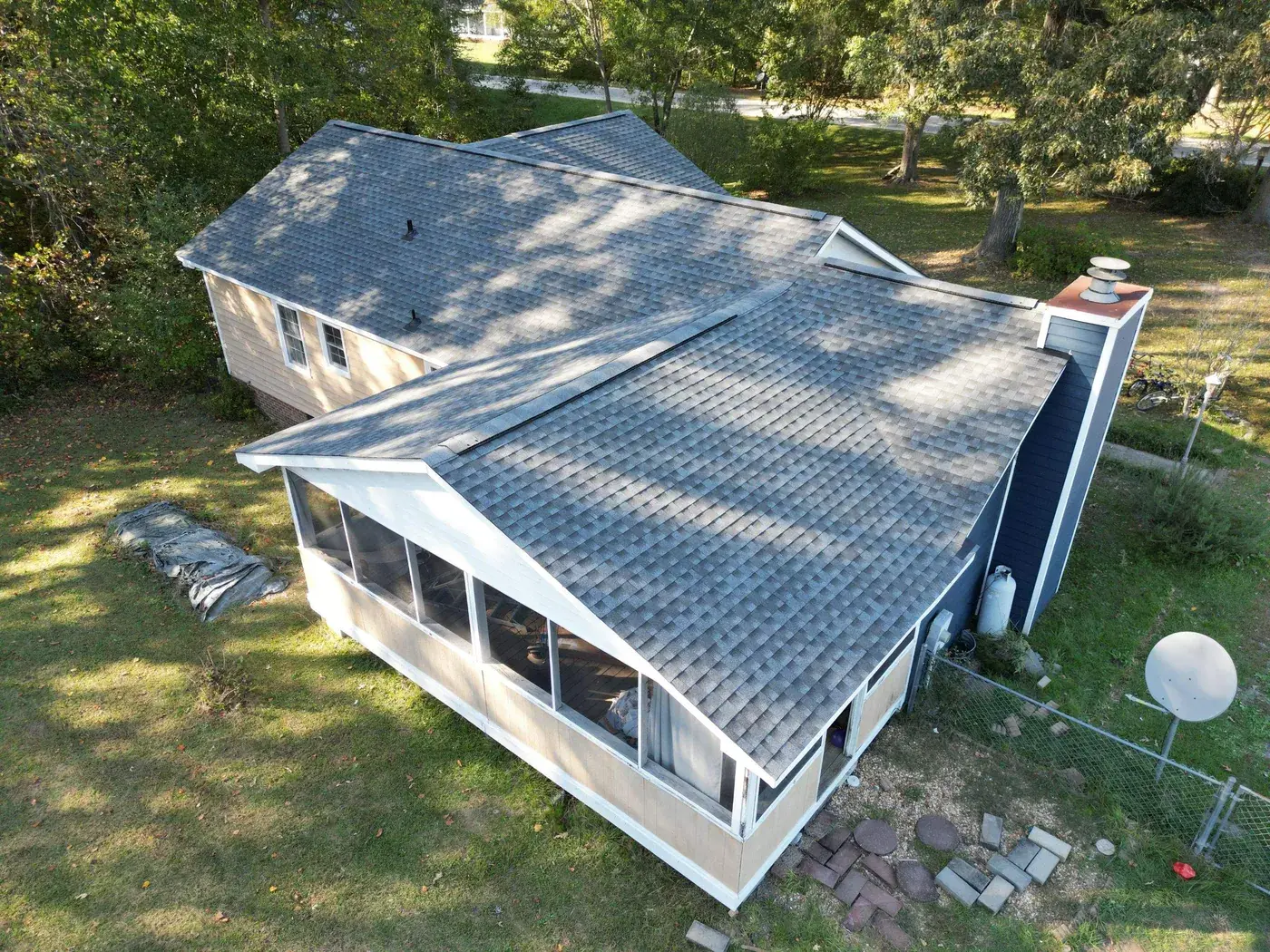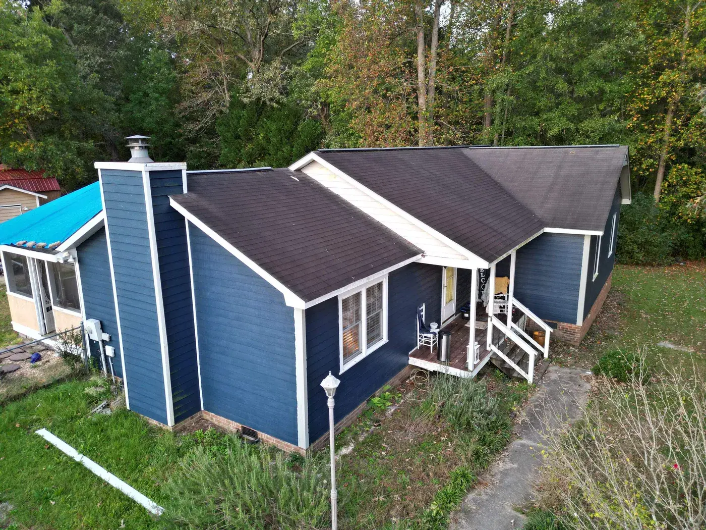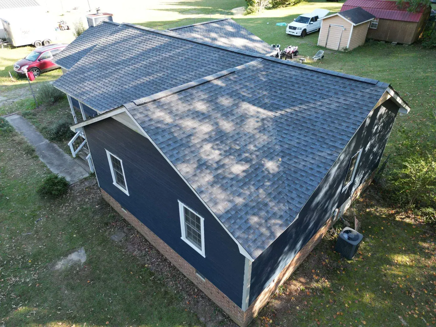 Stancil Dr in Angier is a single-story home in deep navy board-and-batten siding, the kind of bold paint choice that demands a roof to match its confidence. The 27 squares this took ran across an irregular T-shaped footprint with a center brick chimney to flash. We installed GAF Timberline HDZ in Pewter Gray. The cool gray reads beautifully against the navy walls and ties the wings of the home together under one balanced roofline. Total project: $9,995, completed October 2024.