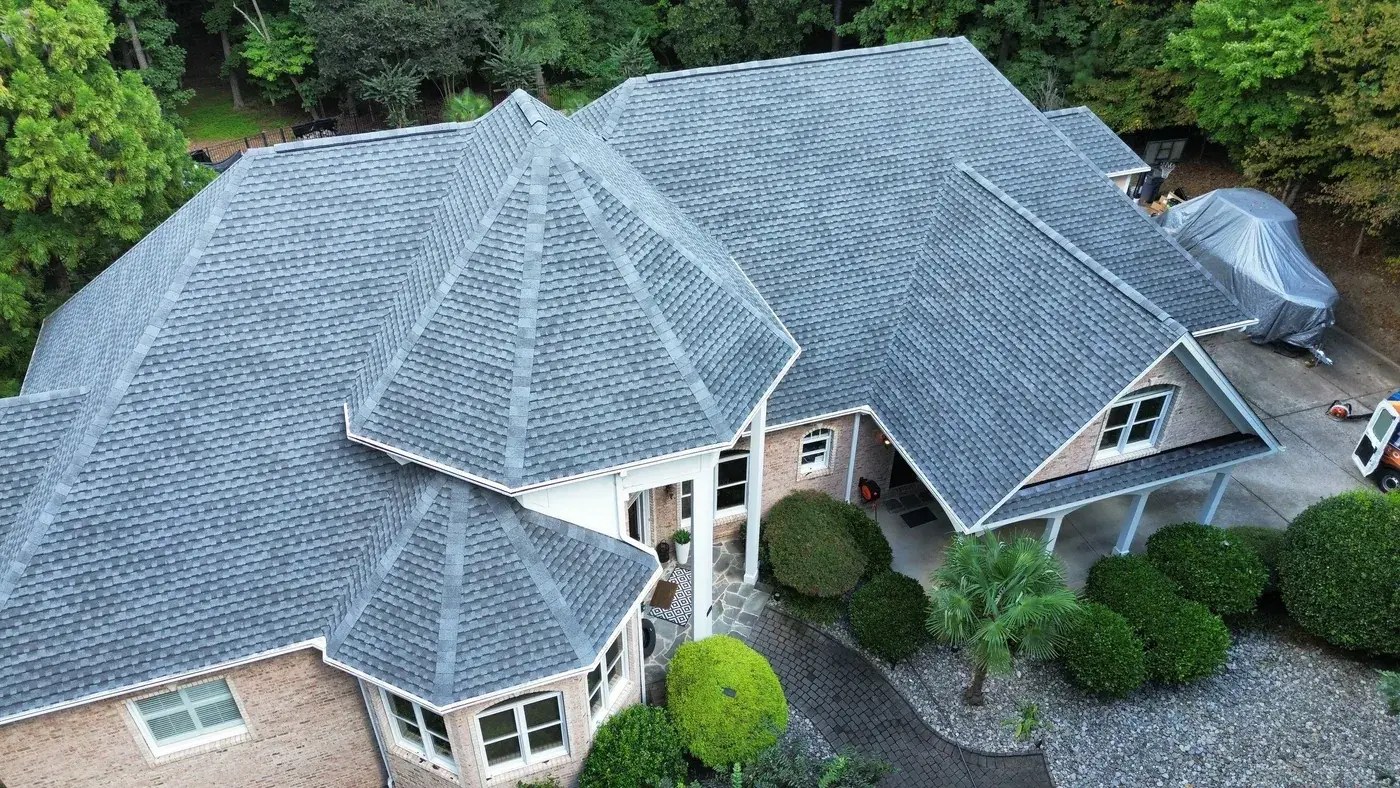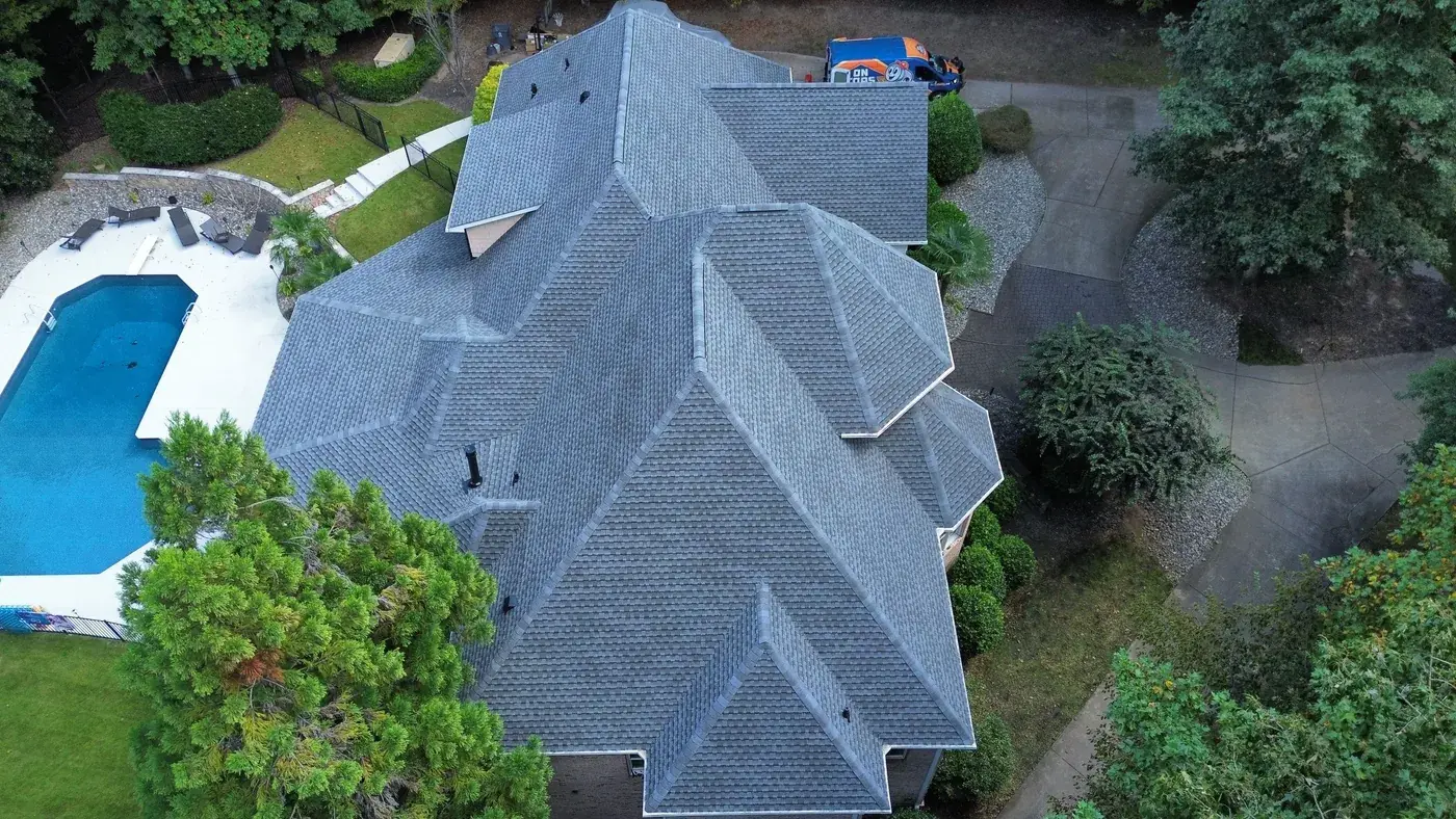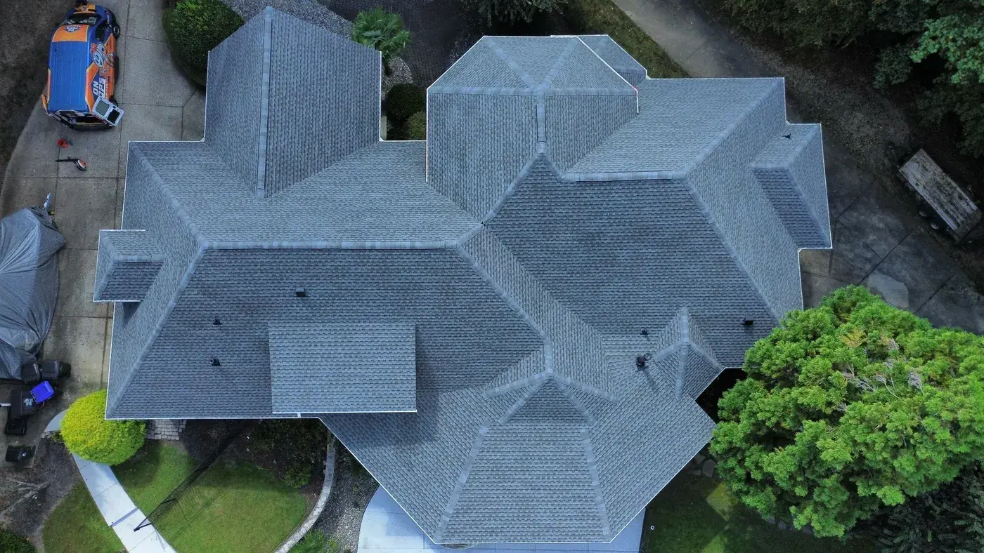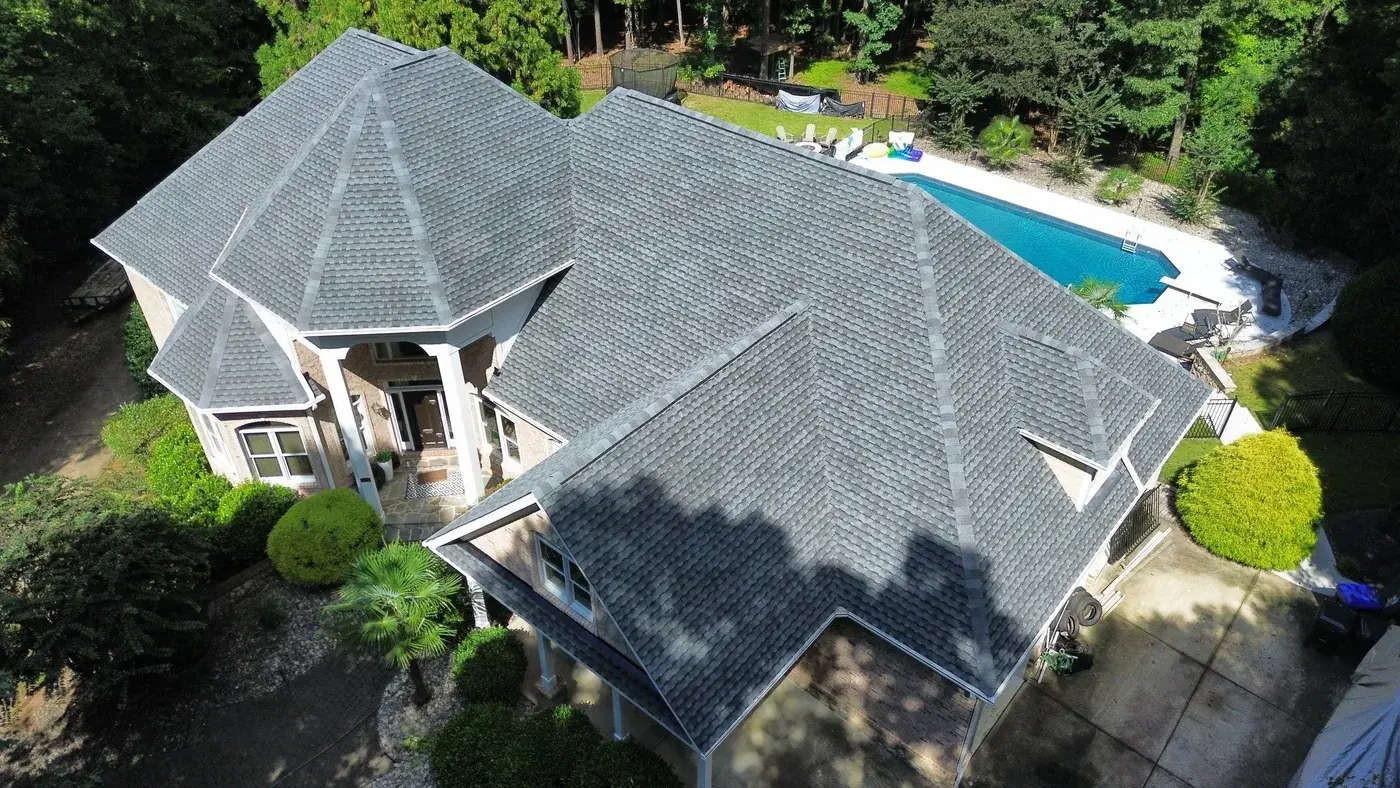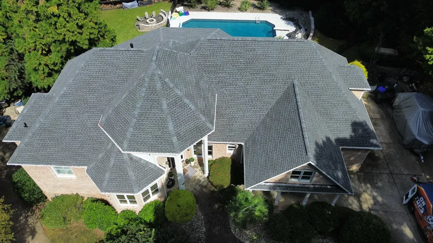 Vista Dell Lago Ln in Wake Forest is one of the largest projects in our log, an 87-square install across an estate-scale home with a deeply complex hipped-and-gabled roof, multiple intersecting planes, and a backyard pool. A roof this large takes a coordinated crew and a methodical approach to every transition. We installed GAF Timberline Ultra HDZ in Pewter Gray. The cool gray reads beautifully across the manicured property and gives this estate the kind of finished crown its scale demands. Total project: $35,000, completed September 2025.