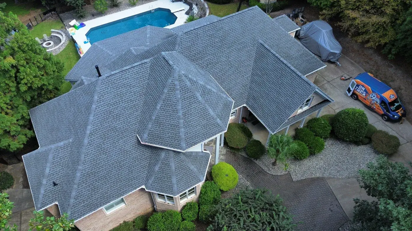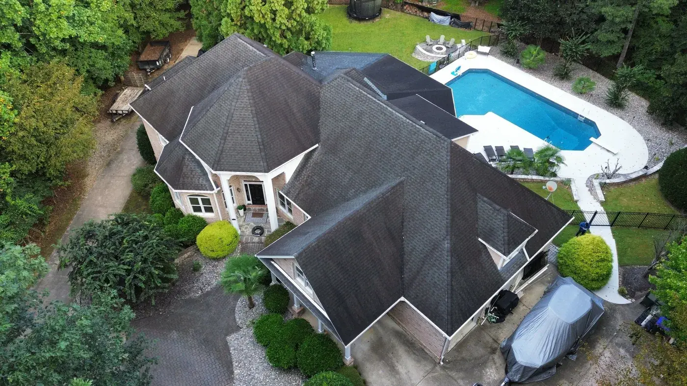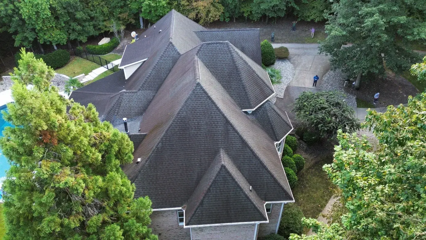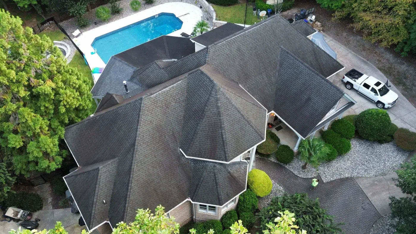 Vista Dell Lago Ln in Wake Forest is one of the largest projects in our log, an 87-square install across an estate-scale home with a deeply complex hipped-and-gabled roof, multiple intersecting planes, and a backyard pool. A roof this large takes a coordinated crew and a methodical approach to every transition. We installed GAF Timberline Ultra HDZ in Pewter Gray. The cool gray reads beautifully across the manicured property and gives this estate the kind of finished crown its scale demands. Total project: $35,000, completed September 2025.