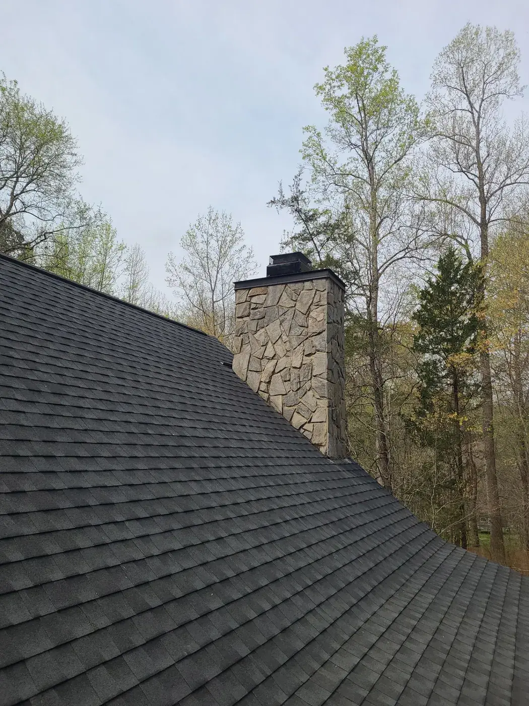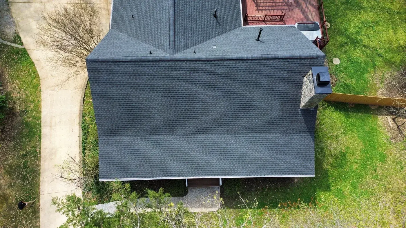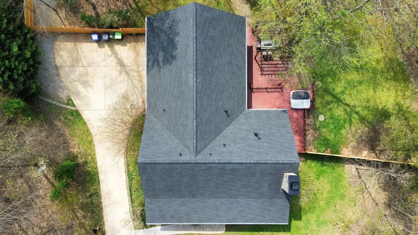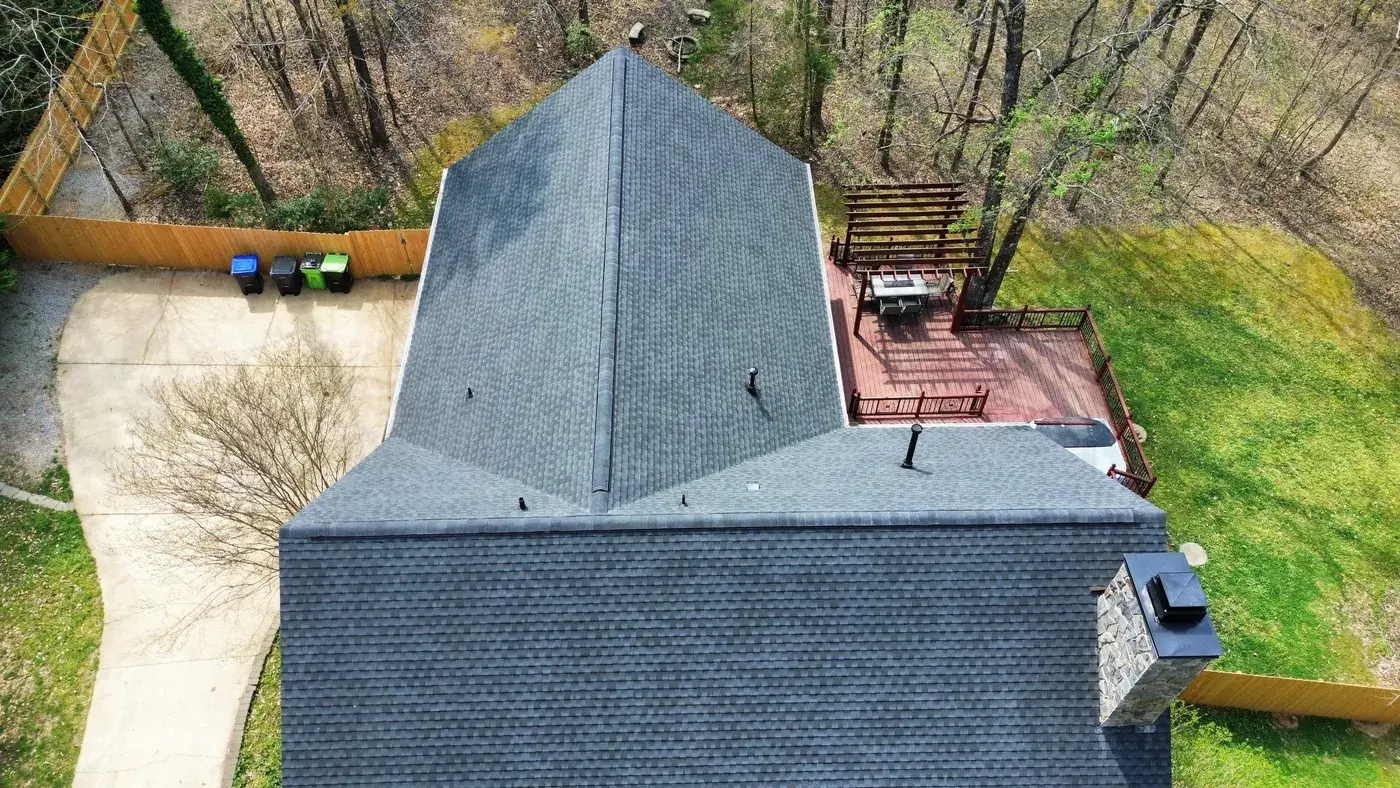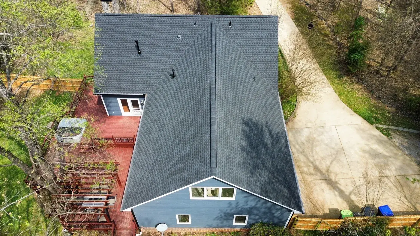 Wolverton Fields Dr in Wake Forest is a two-story home set deep in a wooded lot, with light gray-blue siding above brick, and a cross-gable design where two perpendicular wings meet at a center valley. The 45 squares this took had us focused on the long center valley and the brick chimney transition. We installed GAF Timberline Ultra HDZ in Charcoal. The dark color reads sharp against the cool siding and ties this secluded home together under one deliberate roofline. Total project: $20,880, completed April 2024.