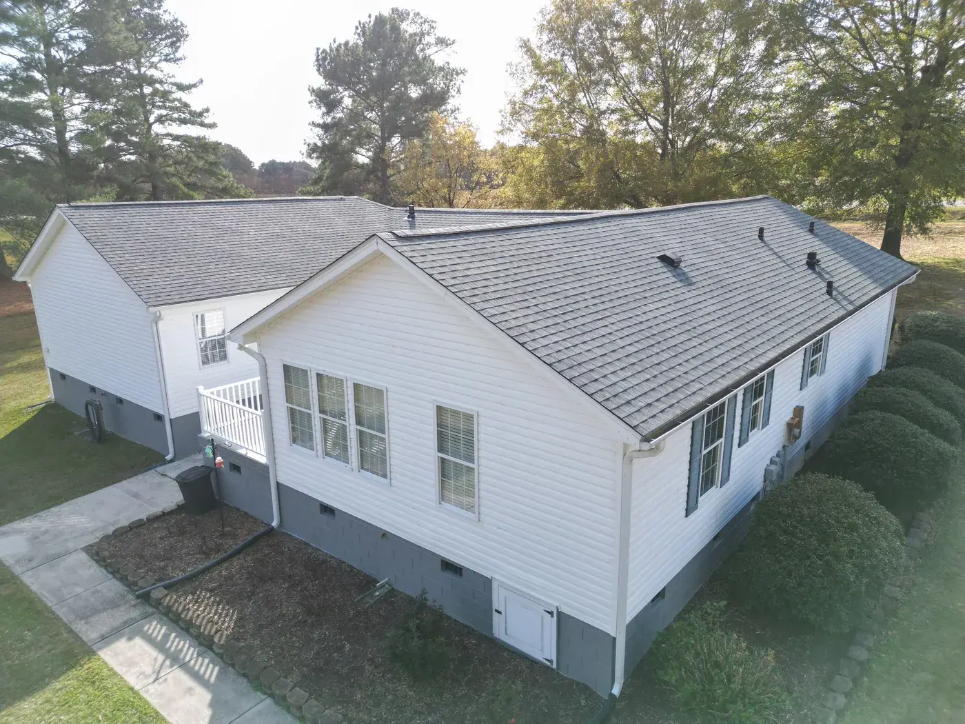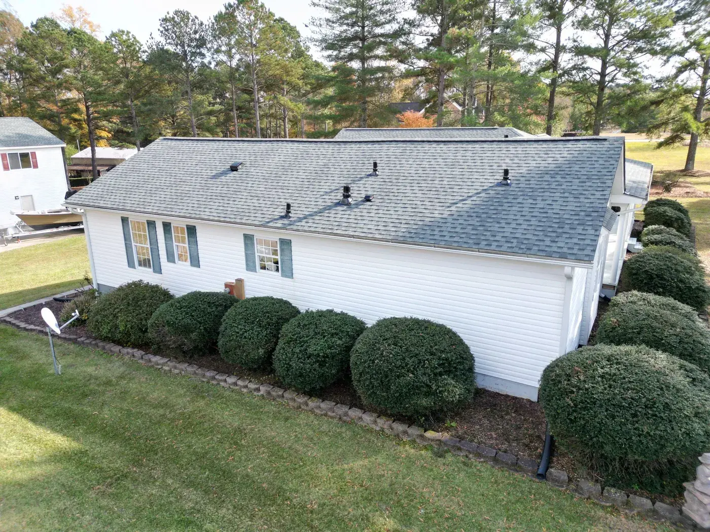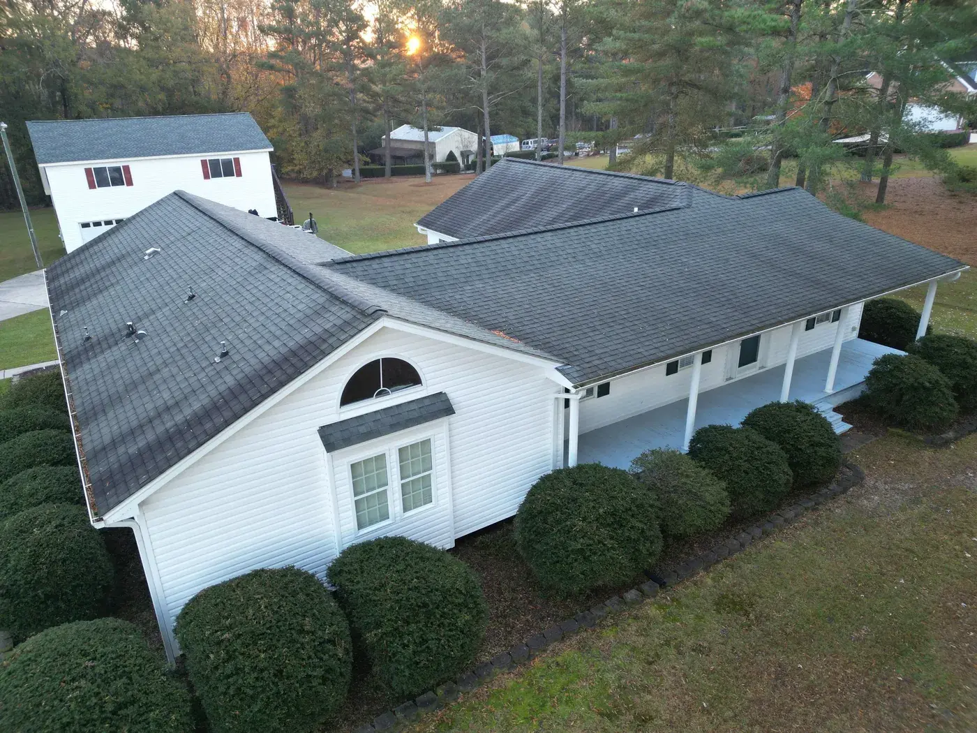 Zachs Mill Rd in Angier is a long ranch home in white siding with multiple front-facing gables, a graceful arched window in the center gable face, and manicured boxwood hedges running the length of the foundation. The 40 squares this took ran across several gable transitions and included a wing extension to flash cleanly. We installed GAF Timberline HDZ in Slate. The cool gray tone reads beautifully against the white body and the trimmed landscaping, giving the home an unfussy but deliberate finish. Total project: $17,000, completed November 2025.