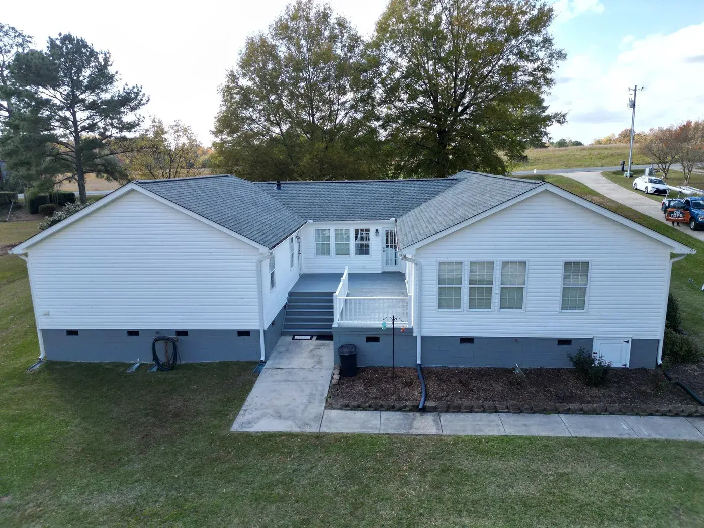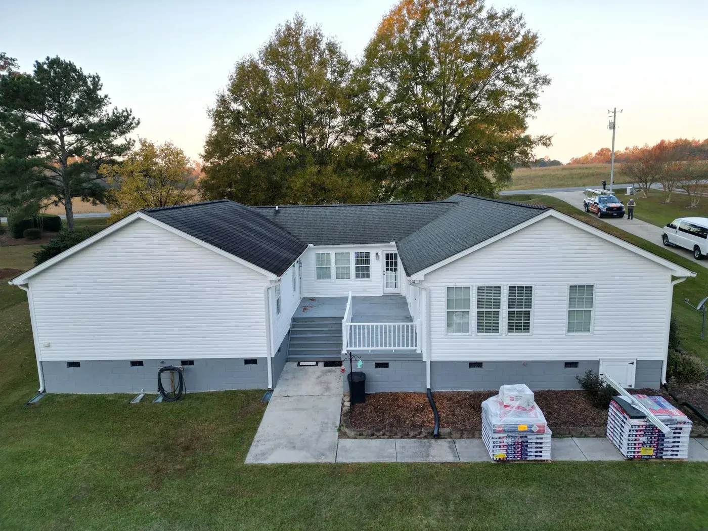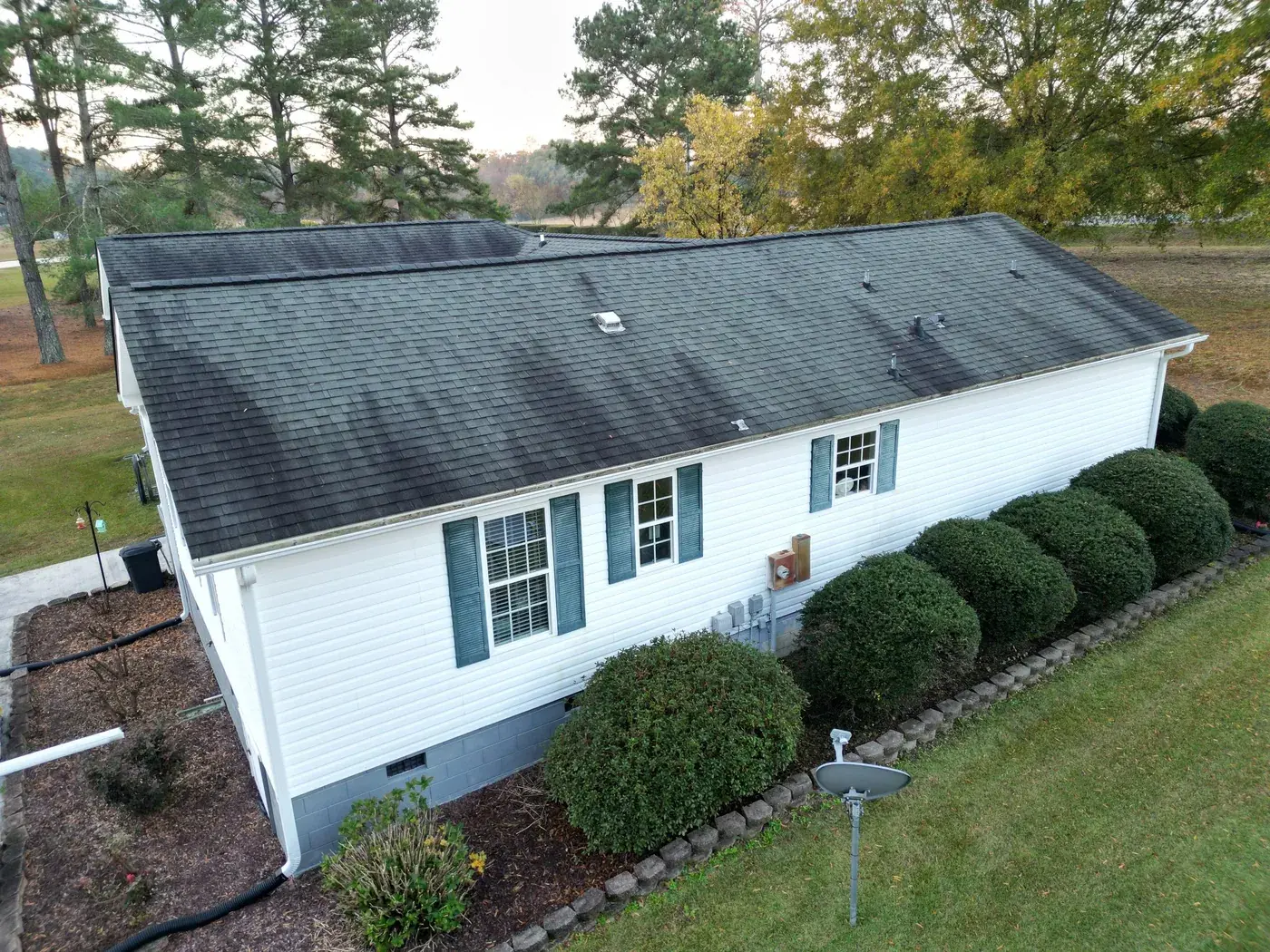 Zachs Mill Rd in Angier is a long ranch home in white siding with multiple front-facing gables, a graceful arched window in the center gable face, and manicured boxwood hedges running the length of the foundation. The 40 squares this took ran across several gable transitions and included a wing extension to flash cleanly. We installed GAF Timberline HDZ in Slate. The cool gray tone reads beautifully against the white body and the trimmed landscaping, giving the home an unfussy but deliberate finish. Total project: $17,000, completed November 2025.